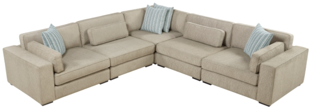 Maximize your living space and seating with this expansive 5-Piece Modular Sectional Sofa, expertly crafted with a durable solid wood and plywood frame and upholstered in a popular, soft chenille fabric. This configurable set includes a left side facing chair, two armless chairs, a corner seat, and a right side facing chair.Read More