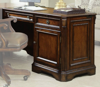 One door with one adjustable shelf and one pullout tray for printer behind, center drawer with drop-front for use with a computer, one utility drawer with partitioned storage tray, all drawers on steel ball bearing drawer slides, pullout writing shelf, wire access grommets, levelers