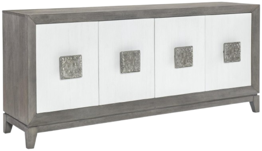 The deeply wire-brushed nightfall finish gives a tactile, dimensional texture, contrasting with the white cloud case fronts and upholstery and metallic-finished table and chair bases. Over scaled, jewelry-like polished nickel hardware adds a glam touch. The clean silhouettes paired with natural color tones and organic textures give a minimalist yet inviting appeal.