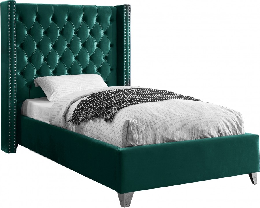 Elegant and eye-catching, the stunning Aiden Bed from Meridian Furniture is the perfect addition to any bedroom. Rich velvet covers the deep tufted design. A beautiful wing bed design is complimented by hand applied chrome nail head details. Strength and beauty is guaranteed with a solid wood frame and stainless steel legs.Read More