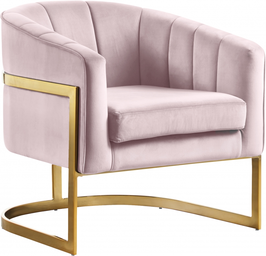 Add a touch of modern drama to your space with this Carter Pink Velvet Accent Chair from Meridian Furniture. This chair offers a super plush cushion that cradles your body in exquisite comfort as you sit, making it easily become your favorite spot in the house. Tufted channels on the arms and back add a textured feel to the chair, and it's upholstered in pink velvet, so it's soft and supple against the skin. The stainless steel base is finished in gold, adding to its elegant demeanor for your modern home.