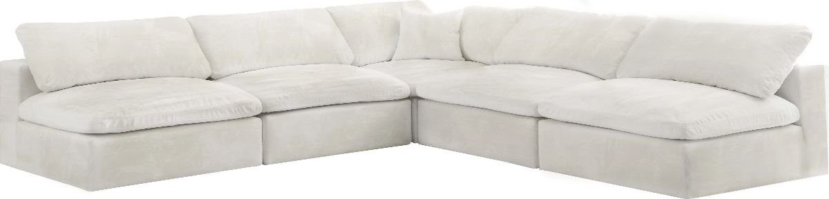 Bring home this Cozy 5-piece sectional for a fresh new look. Embrace casual elegance with this Cozy velvet cloud-like comfort modular fiber-filled seating option. Handsome from all angles, this piece features soft cream velvet upholstery to make it an easy fit in any room.Read More