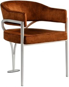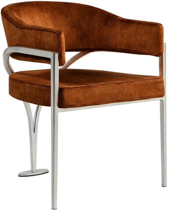 Upholstered in luxurious cognac velvet that's inviting to the skin and super soft to the touch, this chair features an iron metal frame for durability and lasting use in your busy home. The brushed chrome finish adds a final modish touch to this lovely dining chair.