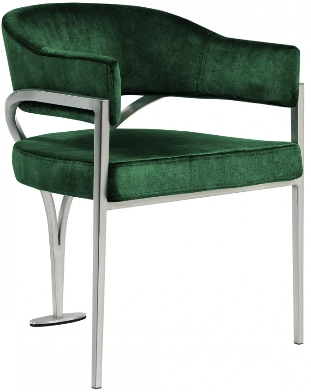 Upholstered in luxurious green velvet that's inviting to the skin and super soft to the touch, this chair features an iron metal frame for durability and lasting use in your busy home. The brushed chrome finish adds a final modish touch to this lovely dining chair.