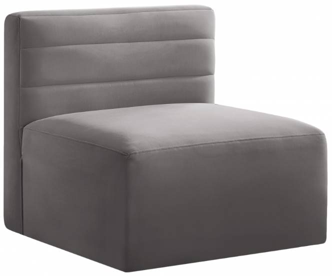 The soft grey velvet upholstery is sleek to the touch, and the back of the unit features deep horizontal channel tufting for a look that wows. Because this is a modular seating option, you can pair it easily with other items in the Quincy collection to create a look you love. Latches underneath make it easy to mix and match items from the collection.