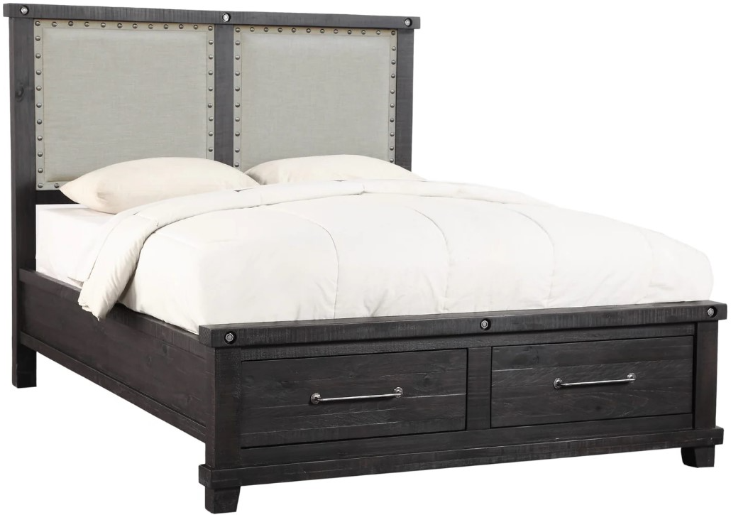Features 2 full extension footboard storage drawers fitted with hammered metal bar pulls that add to the industrial appeal with an improvised, hand-forged look