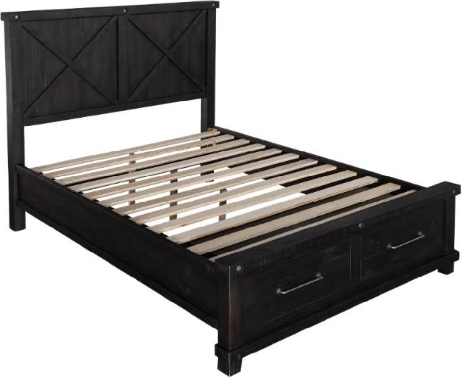 Features 2 full extension footboard storage drawers fitted with hammered metal bar pulls that add to the industrial appeal with an improvised, hand-forged look