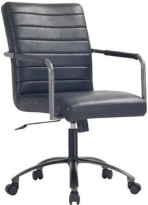 The Roy office chair's channel-seamed upholstery, tailored in top-grain leather, offers comfort and support for extended work sessions. Its leather-wrapped armrests infuse warmth into the iron frame. The chair's ergonomic design promotes better posture, adapting seamlessly to a variety of interior settings without the traditional office feel.Read More
