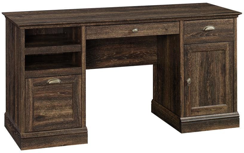 Time to get down to business with this executive desk from the Barrister Lane collection. Its spacious tabletop surface provides you with room for all your must have office essentials – laptop, notebooks, décor, and of course your favorite coffee mug. This handsome desk features two storage drawers that open and close on smooth metal runners. It also includes a lower file drawer with full extension slides to accommodate letter-size hanging files so you can keep organized and clutter free! Behind the door is a hidden storage area that includes an adjustable shelf for all your additional storage needs. It also features open cubbyhole storage with an adjustable shelf for all your easy access office items. Finished on all sides in a stunning Iron Oak and accented with gold hardware, this good looking desk will have you motivated and feeling like a top executive.
