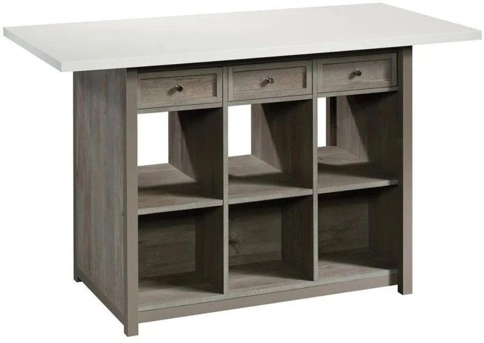 Take your crafting to the next level with the Craft Work Table with Storage from the Craft Pro Series® collection. The melamine top surface of this worktable with storage is heat, stain and scratch-resistant: meaning, you can stay worry-free with even the most daring hobby projects. Below the spacious top surface are three storage drawers that can be pulled out from either side of the table for optimal use. These drawers in your crafting table are perfect for smaller items like thread, needles, scissors and more! Even better, the drawers are removable and can function as a tray on the top surface for various craft items. This craft table with storage also includes multiple open shelving display space perfect for a sewing machine or organizing bins. Finished on all sides for versatile placement, this work desk will be stylish and functional no matter where you arrange it. Finished Mystic Oak® with White top surface accent, this craft worktable is the perfect upgrade your home needs.
