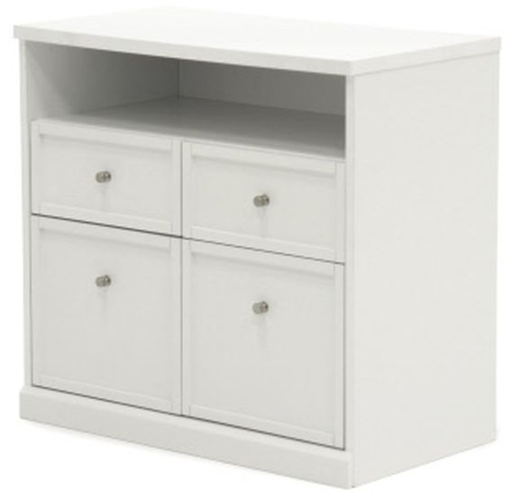 Scrapbook paper, scissors, and stamps - store it all in this storage cabinet from the Craft Pro Series. It features four easy gliding drawers with full extension slides and an open shelf for easy access storage of all your crafting materials. It also includes a melamine top surface that is resistant to heat, stains, and scratches. Finished in White, this sleek storage cabinet is the perfect solution to all your storage needs.