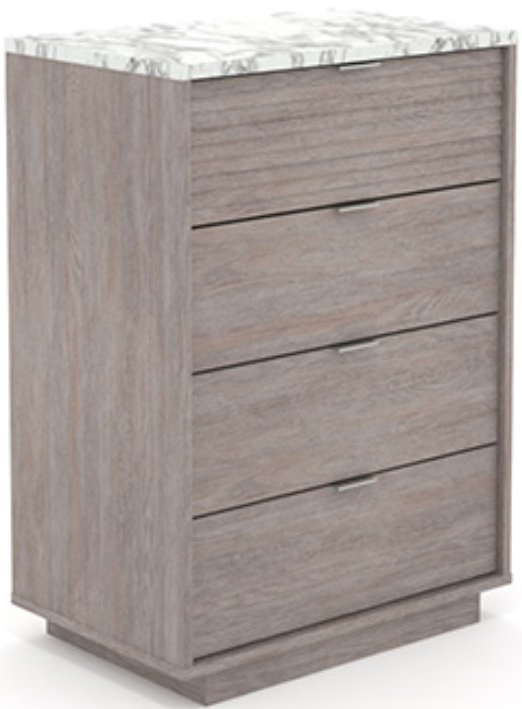 This contemporary bedroom chest of drawers features four spacious drawers that open and close on smooth metal runners for easy access storage of items like denim, t-shirts, workout wear, and more. Visual interest is driven with a louver-detailed front panel on the uppermost drawer front and a spacious top surface accented with high-wear DuraGraph® faux white marble. The top of this 4-drawer dresser provides room for additional storage and display of items like a makeup bag, bottles of perfume, and photos of the family. Assembly is made easy with a T-lock drawer system so you can spend more time admiring this dresser with drawers, and less time assembling it. Finished in Ashen Oak™, this contemporary bedroom dresser brings modern style and functional storage in one piece.
