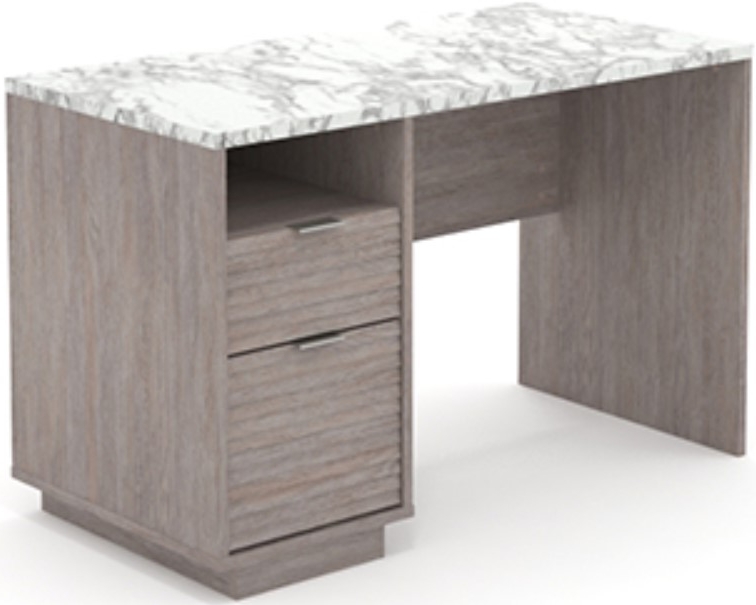 The lower drawer of this contemporary pedestal desk holds letter or legal-size hanging files so all your most important documents are organized and easy to find. An open shelf for additional storage of books, binders, or other supplies makes this desk the perfect addition to your home. This pedestal desk with drawers is finished on all sides for versatile placement anywhere – it will look great from every angle! Cord management pass-throughs in the back help eliminate wire and cable clutter. Finished in a soft Ashen Oak™, the top is brilliantly accented with high-wear DuraGraph® faux white marble patina.