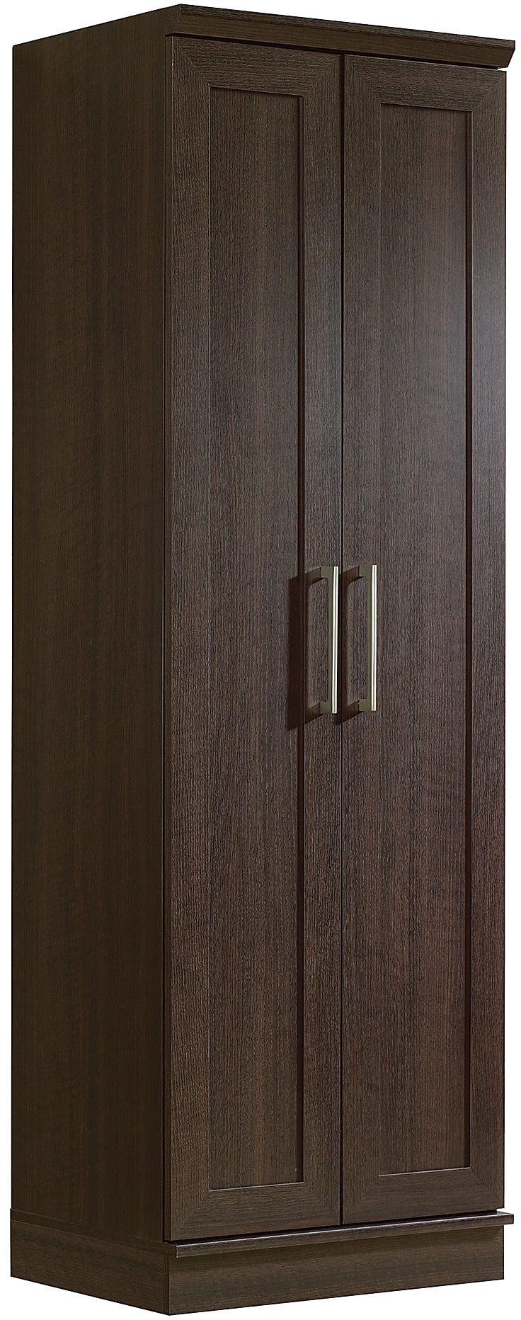Increase the overall storage in your home with this storage cabinet from the HomePlus collection. . Behind its framed panel doors are four adjustable shelves to store pantry food, towels, supplies and more! It features adjustable base levelers and an enclosed back panel with cord access. Finished in a sleek Dakota Oak, this storage cabinet will have your home looking stylish and organized in no time.