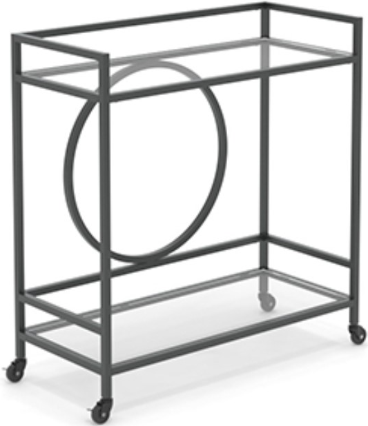 Two casters have lock levers to keep the rolling serving cart in place as you cater to guests or refill a drink. Display your wine and spirits or entertain friends with appetizers on this glass and metal bar cart. It’s finished on all sides, so this bar cart with wheels will look good no matter where it’s positioned in the room. The metal construction of this cart allows for long-lasting durability and the Black finish on all sides makes it a sleek and modern fit for any room in your home.