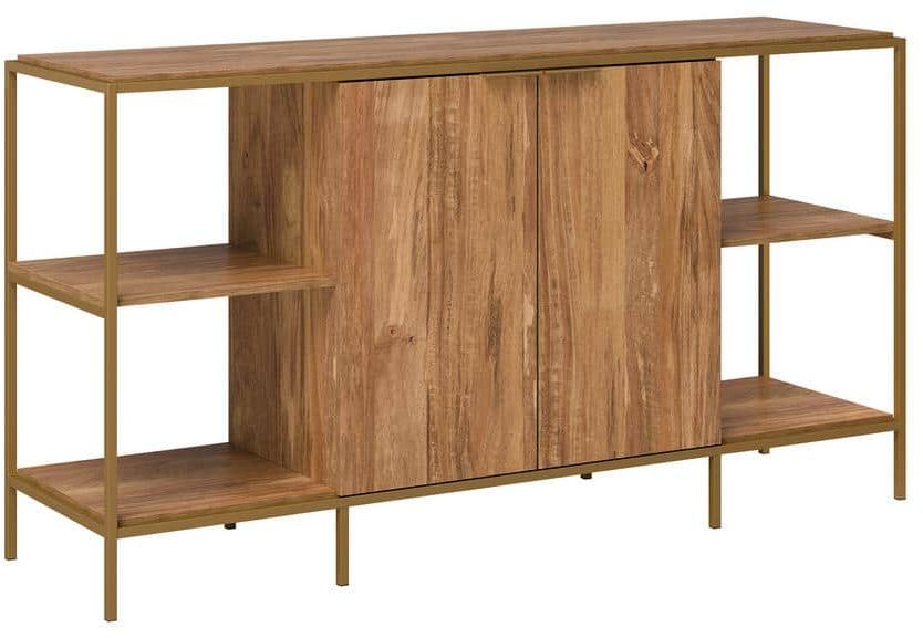 Modern elegance is an aesthetic that never goes out of style. Whether you need a TV stand or additional open storage in your home, this versatile credenza from the International Lux collection is the perfect addition to your home. This TV credenza accommodates up to a 65” TV weighing 70 lbs. or less. If you are not looking for a TV stand, this wood and metal credenza has a spacious top surface for home décor, books, or items like candles and knick-knacks. Hidden storage behind the two large doors features a large adjustable shelf to accommodate items of various heights. Customize this hideaway space to fit to your storage needs! Four open shelves allow you to store and display the rest of your items like magazines, plants, or organizing bins. A cord management system is included with this credenza TV stand to keep your electronic cords tidy and clutter free. This modern TV stand is finished on all sides for versatile placement in any room of your home and looks complete from every angle. Finished in a warm Sindoori Mango® with a metal frame in Satin Gold, let this entertainment credenza add warmth and style to your home.