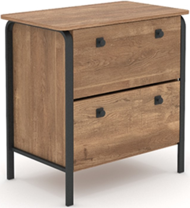 An interlocking safety mechanism allows only one drawer to open at a time. The top surface of this 2-drawer filing cabinet is the ideal place to display items like home décor, photos of family and friends, or your much needed printer. Additionally, books, binders, and other home office essentials can be displayed or stored on top of this industrial filing cabinet. Finished on all sides for versatile placement in any room of your home, this cabinet looks polished from every angle. Finished in Etched Oak™ with a textured, powder coated metal frame, this legal size filing cabinet gives your home office a retro-industrial feel.