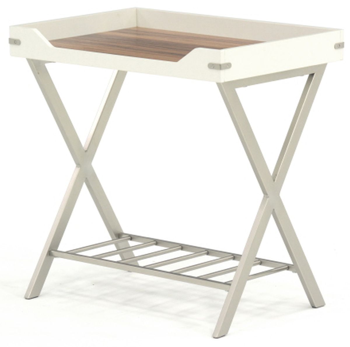Every couch deserves the perfect side table. Find a place for all your couch-side necessities with this side table from the Vista Key collection. This unique side table features a spacious, attached tray that provides you with the ideal amount of space for items like an accent lamp, the TV remote, coasters, and your refreshing cup of sweet lemonade. The tray doubles as a great spot to display home décor items like decorative plants, knick-knacks, and photos of your family. This accent table features a metal frame and lower shelf in a brushed nickel finish. The lower shelf provides you with additional storage space for items like books and magazines. The attached tray is accented with metal corner brackets for an extra touch of detail that is sure to stand out. This side table is finished on all sides so it’ll look great from any angle in your home. Finished in Pearl Oak with Blaze Acacia accents, this attractive end table is just the right accompanying piece to complete your room.