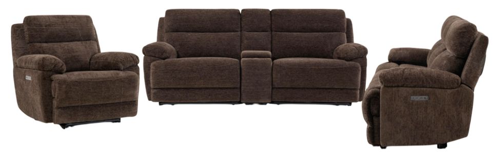 Fully Inclusive Set: The 3-Piece Modular Set includes the Gatlin Brown Fabric Dual-Power Sofa (LAF Dual-Power Recliner, RAF Dual-Power Recliner, and Armless Chair), Loveseat (LAF, RAF, Console) and Gatlin Brown Fabric Dual-Power Recliner. Each item also sold separately.