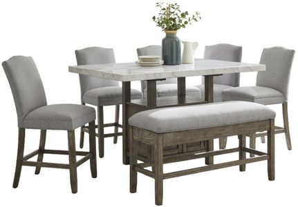 Refined rustic styling brings an elegant casual feel to dining in the Grayson Counter Dining Set. A beautiful white marble top pairs beautifully with a Driftwood finish and ash-gray fabric on Counter Chairs and Bench. The Bench and Table offer valuable storage for placemats, silverware or other items.Read More