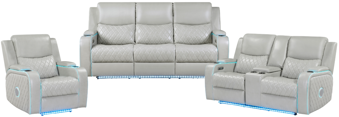 Transform your living room into a personal theater with the Luna Ice Power-Reclining 3-Piece Set, upholstered in smooth ice-gray vegan leather with elegant argyle quilting on seats, backs, and sides. Built-in speakers provide immersive, room-filling sound, while illuminated cupholders and subtle under-frame lighting create the perfect cinematic atmosphere.Read More