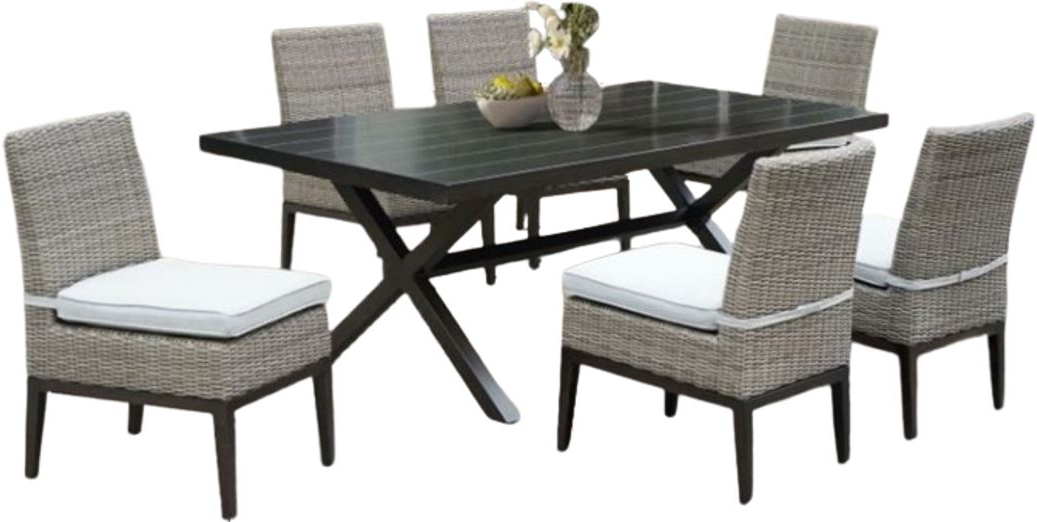Set includes powder-coated aluminum table and 6 side chairs