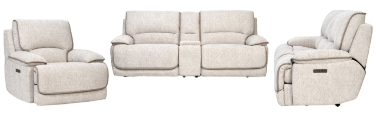 Relax in premium comfort with the Olsen 3-piece dual-power set, featuring a sofa, console loveseat, and recliner in a clean, transitional style that fits both modern and classic spaces. Upholstered in plush, low-pile 100% polyester with refined vinyl welt accents, each piece offers lasting softness and durability.Read More