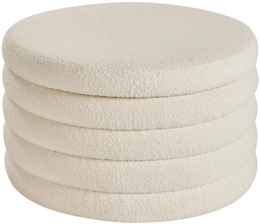 The obi storage ottoman is a fully rounded, functional masterpiece upholstered in the soft berber snow fabric. Its top lid reveals convenient inside storage, while five casters ensure mobility. The oversized horizontal tufting detail adds a rich, textural dimension to its fully upholstered body.Read More